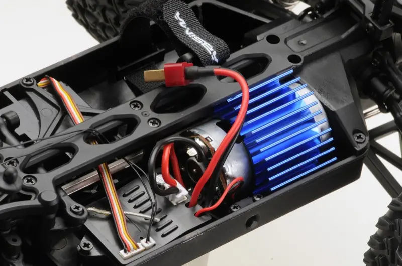 2.4GHz remote control system with foam rubber steering wheel for good grip! Straight line and top speed are easily adjustable via rotary knobs