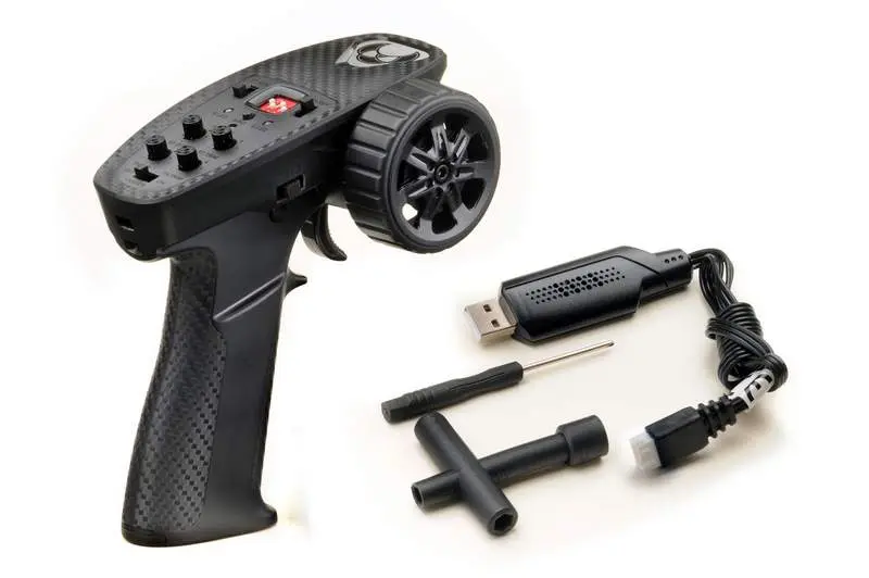 – Speed controller 2-in-1 ESC/RX unit, PPX4, 10A/50A- Remote control: 2.4GHz, 4-channel- Steering servo: 1kg actuating force, waterproof- Motor: 030 / 88T- Gear ratio: 104:1- Battery: LiPo 7.4V/2S 360mAh- Battery connector system: Molex 2-pin- Charger: USB fast charger (7.4V; 1000mAh) - Wheelbase: 121mm- Ground clearance: 25mm- Track width v/h: 100mm - Length: 215mm- Height: 120mm- Width: 104mm - Weight: approx. 250g- Wheels: 18x45mm