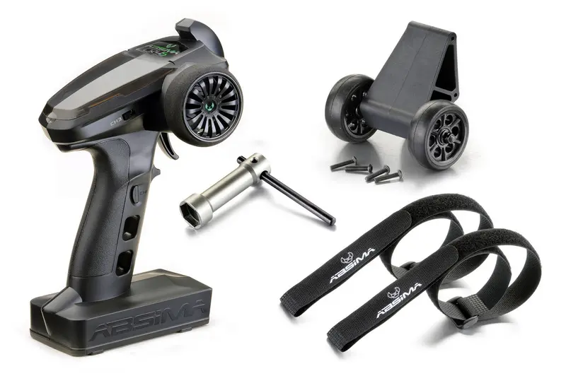 The ABSIMA CR4S 4-channel remote control including R4WP-Micro receiver has a foam rubber steering wheel and a “beginner mode” which reduces the engine power to 50%. In addition, you have 2 more channels available to control, for example, the separately available mechanical handbrake.
