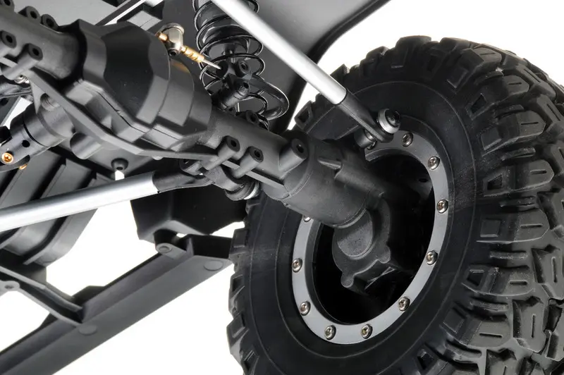 Stylish 2.2-inch beadlock wheels with aluminum rings and 12-bolt design.Super soft tires with realistic sidewall flex for maximum traction on any rock.12mm aluminum standard wheel hubs fit all standard crawler rims (note portal axles!).