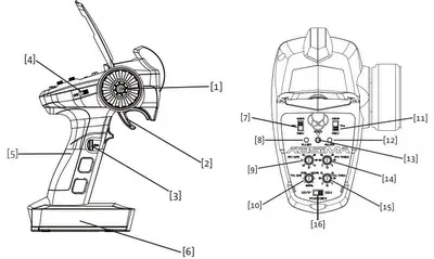 Dual Rate function (D/R): The steering angle and also the motor rotation power can be increased or reduced by operating this rotary knobs.