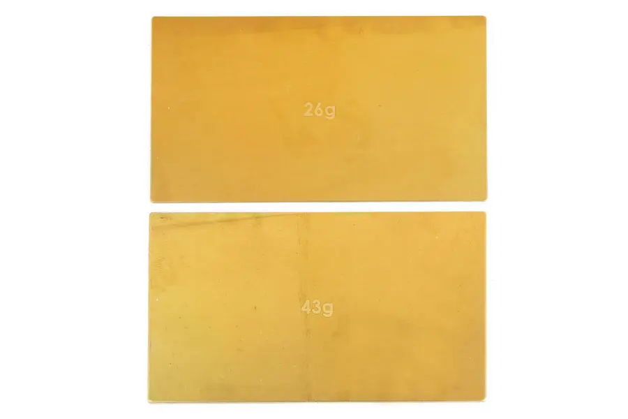 The B6 battery weights fit perfectly under your shorty LiPo batteries so that you can add weight while reducing your vehicle’s center of gravity, resulting in improved handling and stability on high-grip surfaces. Each 3.74″ x 2.08″ brass set contains one each of 26g (.02″ thick) and 43g (.04″) weights, with their numbers etched into the surface.