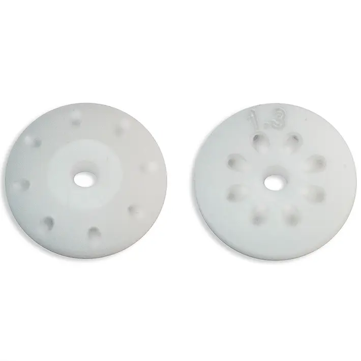 The tapered profile and angled holes of these new shock pistons improve handling through bumps and make the car jump flatter and land better. The angled holes allow you to run lower oil weights to generate more grip.