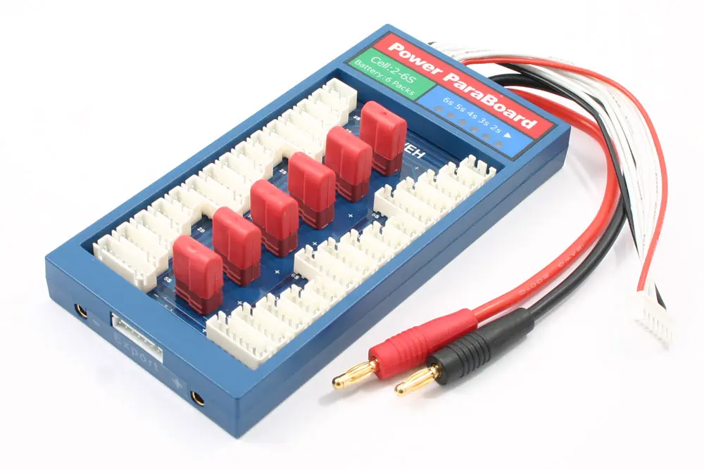 The Power ParaBoard is used to balance charge up to 6 lithium batteries in parallel (they must be same cell count). By using this method you can significantly save time on the battery charge process and finally make use of your high power charger!