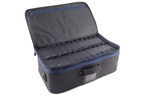 Designed for the 1/10th buggy or Touring Car racer who wants to travel light, this new tailor made bag is ideal for those trips down the club or test afternoon at the track. Integrated section with tool storage, zipped pockets inside flap and storage pockets within area. Can hold vehicle or wheels or tyres. Supplied with shoulder strap and finished in a cool carbon inspired weave.