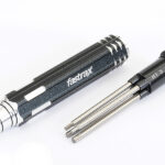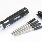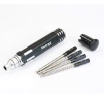 One handle, four wrenches! This space saving tool is ideal for those not wishing to cart the tool box around. The hollow aluminium handle houses 1.5mm, 2mm, 2.5mm and 3mm hex srench bits. Simply select the one you want and slide into the spring clamp holder in the end.