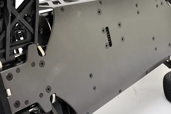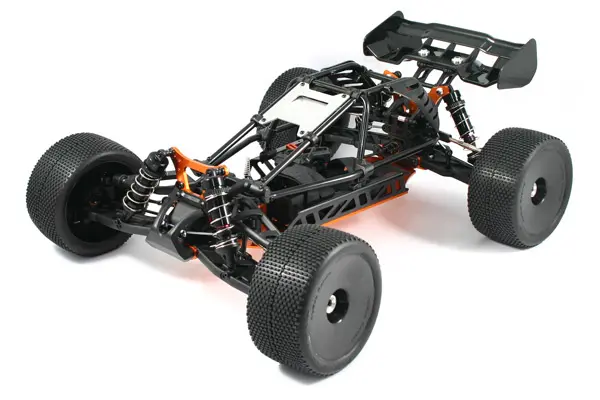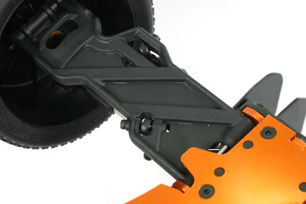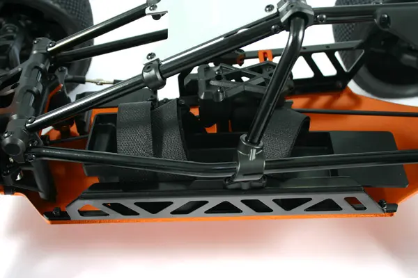 As an electric rolling chassis you are free to decide what electronic package is best for you and your budget. Underneath the roll cage you will find a chassis that can accommodate most of todays current crop of high performance brushless motors, speed controllers and LiPo batteries. The moulded battery tray features three quick release velcro straps perfect for 2S, 3S and 4S packs. Colour coded, anodised aluminium chassis parts complement the roll cage assembly for an eye catching look. The newly designed front C-Hub suspension assembly, 3-differential driveline and 17mm big bore shocks soak up all that is in their path.