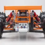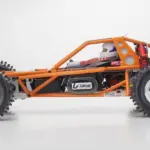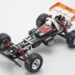The Javelin’s design concept was to create “A machine that redefines what it means to be the best”. After more than 30 years since the original release in 1986, this electric off-road competition model has been recreated as the sixth model in the Kyosho Vintage Series. Incorporating a resin pipe-frame body resembling the innovative aluminum pipe frame body of the 1/8 scale Land Jump engine powered buggy, the new Javelin features the proven performance of double wishbone suspension with a narrow backbone-style skid frame that delivers ideal geometry for wide-angled steering. This combines with the Javelin’s superior sealed compartment 4WD chain-drive system to produce excellent performance and durability. At the heart of the external features that faithfully represent the image of the Javelin of 30 years ago, this Vintage Series version is packed with modern racing performance potential and is compatible with modern power sources. At the heart of the drive system is a counter gear equipped with slipper function and a final gear case made from metal to strengthen its load bearing capacity. The adoption of precision 48-pitch gear modules reduces power loss and the optimal combination of nylon and sintered alloy delivers both improved drive efficiency and reduced noise. In addition to chain drive, the drive system can also be changed to a belt system, which was optional in the original model. Also, the large diameter aluminum shocks, recreated in the original design, combine with long stroke suspension to deliver increased performance potential. Rediscover the joy of off-road buggy racing with the latest in racing technology and the nostalgic style of the ‘Javelin’.