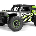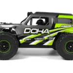 The DOHA features a durable shaft drivetrain and 3-gear differentials, ensuring optimal power distribution for exceptional stability and precision handling across diverse terrains. Its reinforced cage design, coupled with a custom screen-printed, rear-hinged Desert truck body, not only enhances its visual appeal but also provides easy access to the battery tray. Available in four distinctive color options, the DOHA allows for a personalized touch.