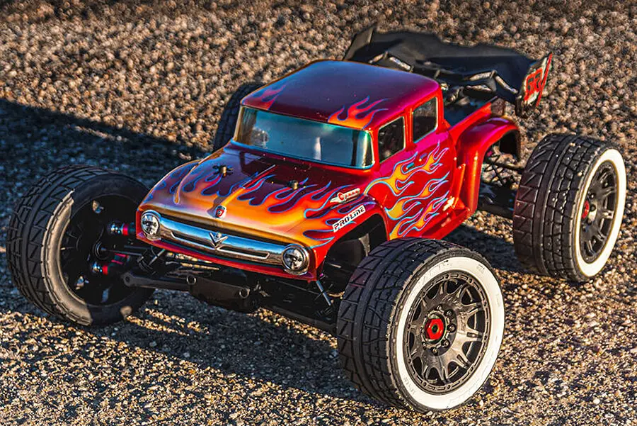 This is a 1956 Ford® F-100 Clear Body for Kraton™ 8S. Pro-Line is excited to bring some retro classic styling to the Kraton™ 8S for the first time! This old-school Ford® F-100 body completely transforms the look of your truck, featuring a custom hot-rod style extended cab, aggressive fender flares, and the iconic old-school chrome grill of the ’56 blue oval fan favorite. Pair the F-100 with the Menace 5.7″ Belted Tires (PRO1020510) for a true street machine combo!