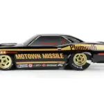 Pro-Line is proud to introduce one of the most iconic Pro Stock bodies of all-time: the Motown Missile! In 1972, fully backed by Chrysler, MOPAR began to secretly develop a Barracuda into the ultimate Pro Stock drag car and “The Missile” was born. It was driven by Don Carlton and the rest, as they say, is history. Now you can have your very own fully licensed replica of the 1972 Plymouth Barracuda Motown Missile Edition Tough-Color Black body for your No Prep Drag Car! This body is made from pre-colored black body material, so you never have to worry about paint chipping or peeling off, hence the name Tough-Color. This body includes high-quality Motown Missile graphics that perfectly match those found on the original version of this iconic dragster. We recommend using our Hoosier 2.2″ Drag Racing Front Tires (PRO10158203) on the front and Hoosier Drag Slick SC 2.2″/3.0″ Drag Racing Tires (PRO10157203) in the rear, and painted Slot Mag Drag Spec Wheels (PRO279205/PRO279305) to complete the ultimate hot-rod look. Get your own Motown Missile Drag Body today!