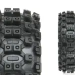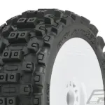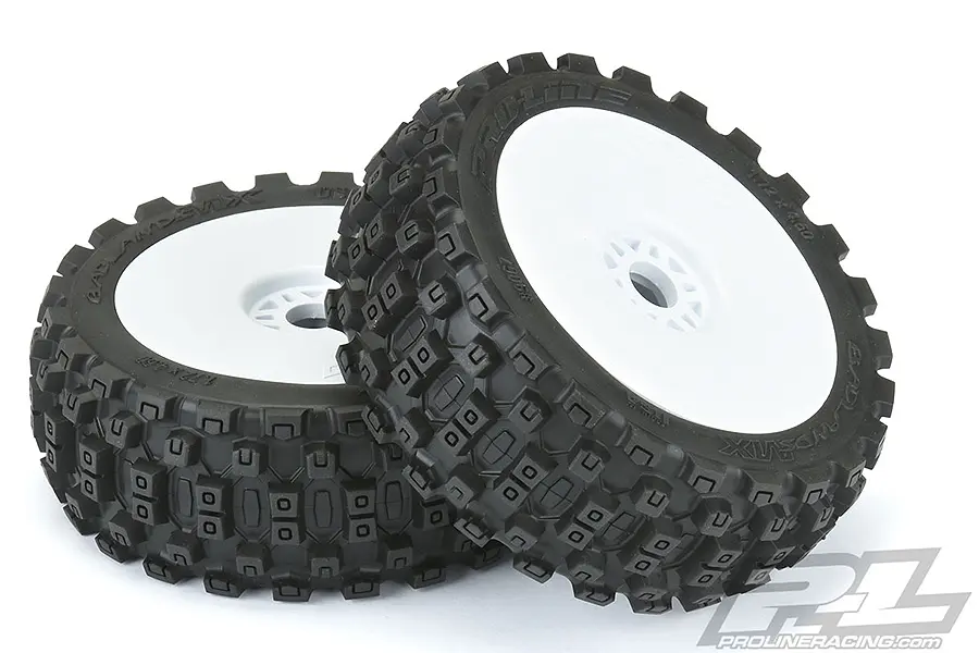 This is a pair of Pre-Mounted Badlands MX Tires for 1:8 Buggy. Pro-Line is taking the 1:8 Buggy tire game to the next level with the Biggest and Baddest tire ever conceived: the Pre-Mounted Badlands MX! Pro-Line Badlands tires are known for having sweet Motocross inspired tread and the all-new Badlands MX tires kick that up a notch with a Bigger and Bolder knobby tread that matches modern MX tire design. The Badlands MX is a true All-Terrain tire that will find traction on any surface but is best suited for loose & loamy dirt, mud or grass. Just imagine your buggy throwing up huge rooster tails with these awesome looking tires!