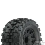 This is a pair of pre-mounted Badlands MX38 HP 3.8″ Belted Monster Truck Tires. Pro-Line is taking the 3.8″ tire game to the next level with the Baddest tire ever conceived: the Badlands MX38 HP BELTED tires! Pro-Line Badlands tires are known for having a sweet Motocross inspired tread and the all-new Badlands MX38 HP tires kick that up a notch with Bigger and Bolder knobby tread. The Badlands MX38 is a true All-Terrain tire that will find traction on any surface but is best suited for loose & loamy dirt, mud or grass. Just imagine your truck throwing up huge rooster tails with these awesome looking tires!
