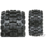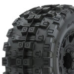 This is a pair of pre-mounted Badlands MX38 HP 3.8″ Belted Monster Truck Tires. Pro-Line is taking the 3.8″ tire game to the next level with the Baddest tire ever conceived: the Badlands MX38 HP BELTED tires! Pro-Line Badlands tires are known for having a sweet Motocross inspired tread and the all-new Badlands MX38 HP tires kick that up a notch with Bigger and Bolder knobby tread. The Badlands MX38 is a true All-Terrain tire that will find traction on any surface but is best suited for loose & loamy dirt, mud or grass. Just imagine your truck throwing up huge rooster tails with these awesome looking tires!