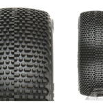 This is a pair of Buck Shot 1:8 Buggy Tires. The Buck Shot debuted at the 2017 ROAR National Championships and is already a Winner at the hands Pro-Line Team Driver Ty Tessmann! The Buck Shot has pins that are very close in size to the amazing Hole Shot 2.0 but the Buck Shot pins are stacked closer together side to side, which provides significantly longer lasting performance. Unique to the Buck Shot are the alternating elongated bars that provide incredible forward grip! Similar to the extremely popular SwitchBlade tire, the Buck Shot is a directional tire with different tread on the outside compared to the inside, allowing you to mount the tires in the direction that suits your current track conditions. One side of the tire has standard pins, which is ideal for loose or low traction conditions where you want the tire to add side grip and improve steering. When you mount the tire the other direction, the connected side tread (Blade) reduces side traction in high-bite or edgy conditions. Racers who have tried the Buck Shot are saying that it is their new favorite tire!