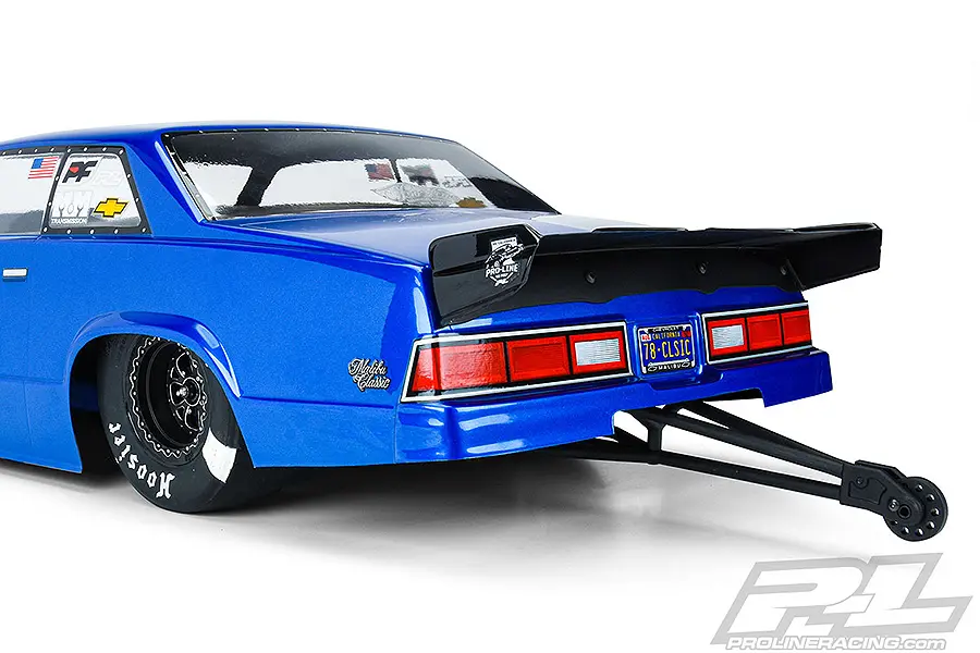 This is a 1978 Chevrolet® Malibu™ Drag Car Clear Body. Pro-Line is proud to introduce the timeless 1978 Chevy® Malibu™ body specifically designed for the growing No-Prep SC Drag Racing scene! Bowtie fans will love this ultra-scale body that captures all the signature details of Mark Micke’s 4,700hp, twin-turbo, 200mph+ G-body Malibu™.