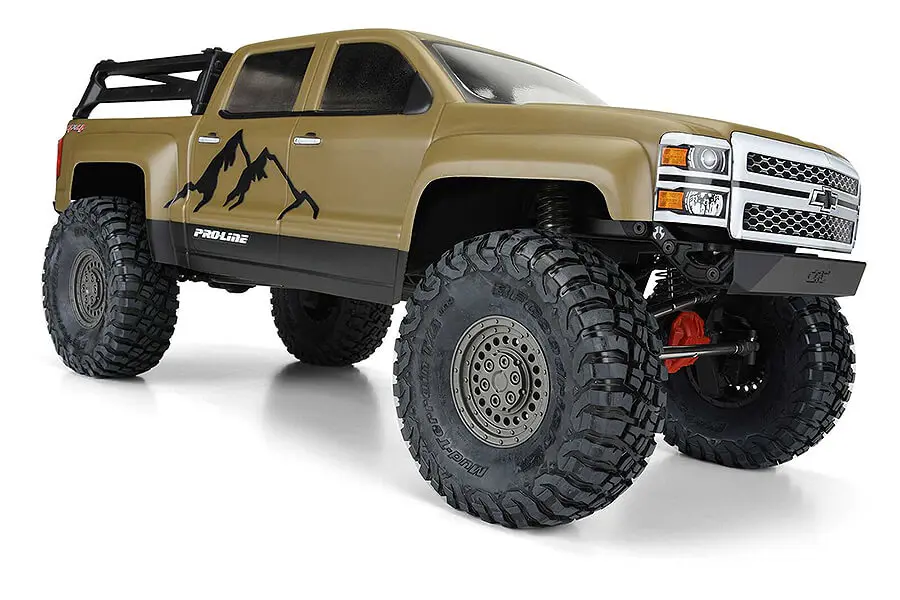 Calling all 13.9″ long wheelbase crawler fans! Pro-Line finally has a body option for your rigs! Introducing the fully Licensed 2015 Chevy® Silverado™ clear body for 13.9″ wheelbase crawlers. This modern Silverado™ features a Crew Cab with a short bed and includes optional headlight and taillight buckets for added scale realism. This body is perfect on an extended wheelbase Axial® SCX10™ III Chassis or as an upgrade to your Axial® RTR Jeep® Gladiator SCX10™ III. The body also includes a scale bed cage made from multiple pieces of polycarbonate as an option for overlanding style builds. The options are limitless with this body! Transform the look of your long wheelbase truck with this realistic 2015 Chevrolet® Silverado™ Crawler body from Pro-Line!