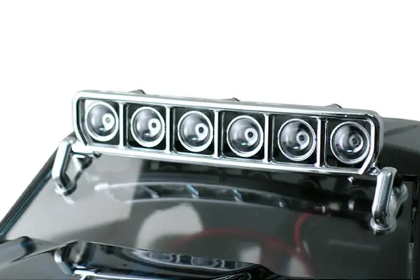 The goal of our Roof-Mounted Light Set was to recreate a scale version of those light bars found in full-sized night racing while striving for some reasonable amount of crash-survivability. What we came up with is a light mount set that uses a unique hinge-based system that in the event of a roll-over, the light bar will collapse against the body to help reduce impact damage. The light set is designed to bolt to the front windshield of the truck (although with sufficient room, it can be mounted to the rear window as well), keeping the profile low and in the perfect position to light up the night! A pair of large backing plates are supplied that help protect the body where the screws hold the light bar in place.