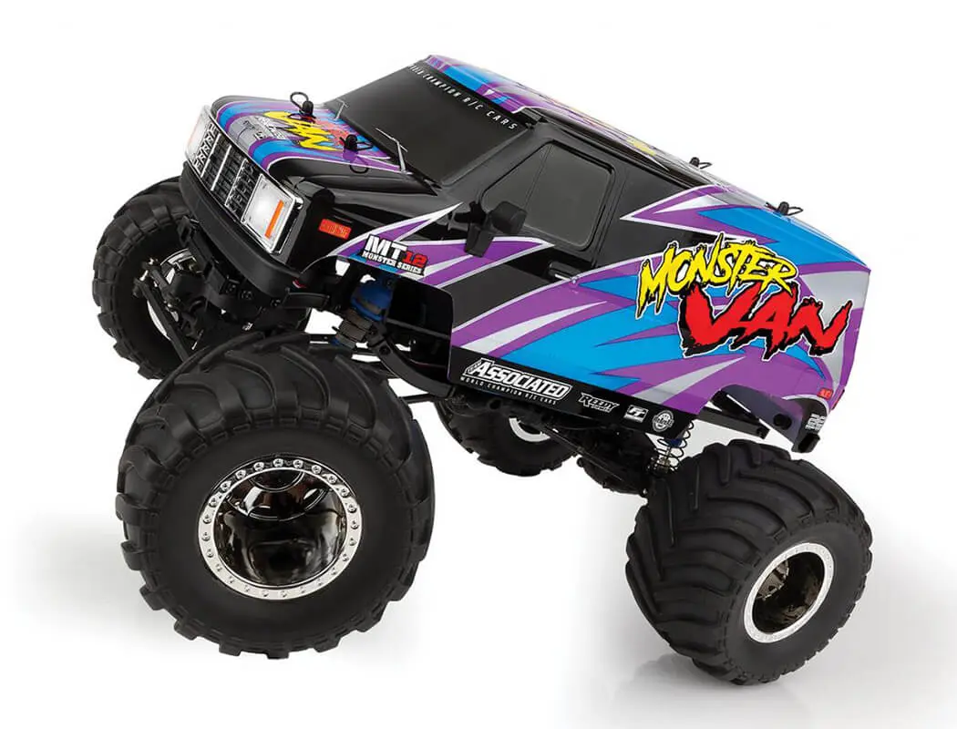 Designed not only for scale looks with realistic chrome wheels, chevron-style tires, and retro-styled van body, the MT12 is built for car-stomping action as well. The steel ladder frame chassis provides the perfect backbone for this rugged little monster. The 4-link suspension, threaded shocks, and soft rubber tires give the grip and performance needed to smash over cars or through dirt and mud. Transferring power to the ground is a compact 3-gear transmission, plastic low-friction slider-type drive shafts, front steel CVA axles, and metal-shield ball bearings.