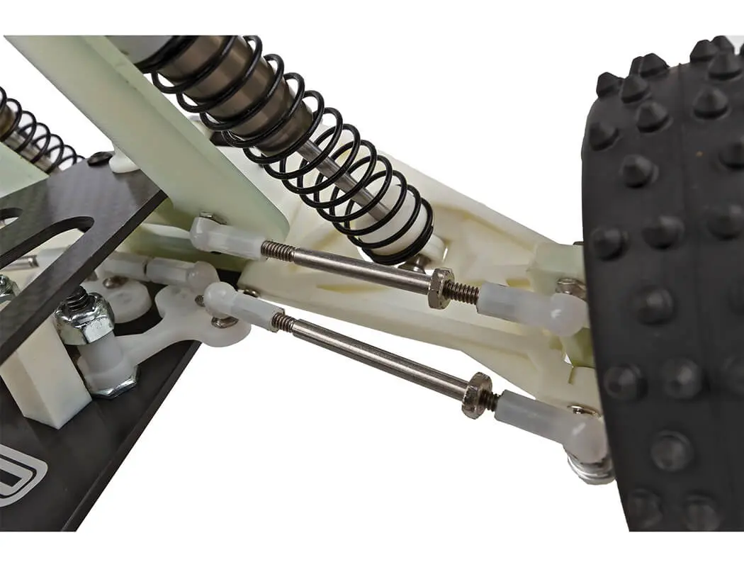The prototype also utilized a narrowed and milled aluminium chassis for reduced weight and improved agility. The front end was modified with new geometry for better steering response, while the rear featured longer suspension arms and revised shock positioning to improve traction and stability. Lightweight materials such as carbon fiber and titanium were used extensively, showcasing a design philosophy that prioritized speed, balance, and durability.