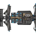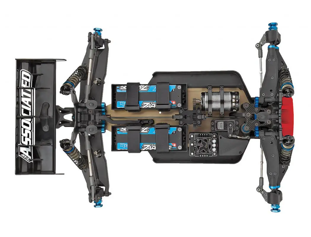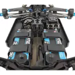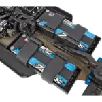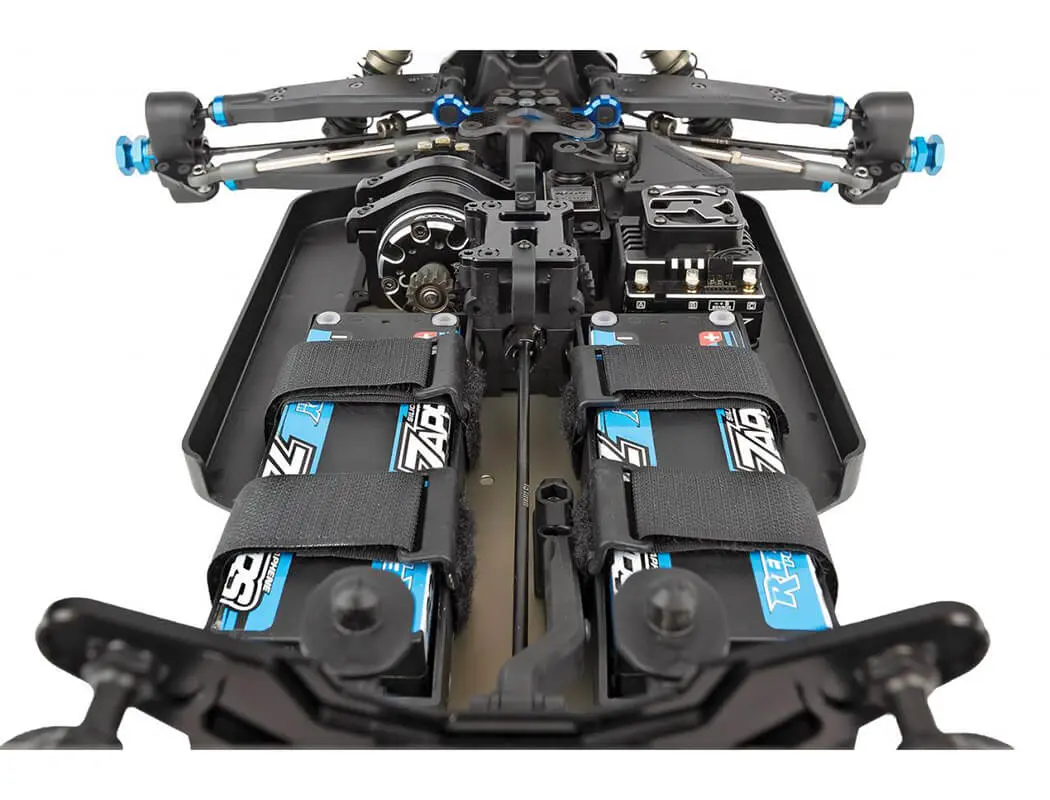 - RC8T4e chassis layout featuring two saddle pack-style battery configurations. Both configurations include a centrally mounted center differential and in-line center driveshafts for superior drivetrain efficiency and equalized chassis balance.
