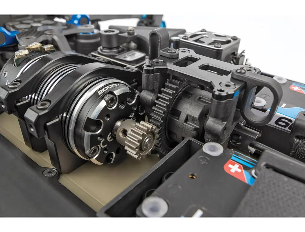 - RC8T4e gearboxes are specific to front and rear with larger bearing sizes resulting in longer life of ring and pinion gears: Front gearbox is a 3.5° inclined pinion gear angle to straighten the center driveshaft for increased drivetrain efficiency and reduced phasing and vibration. Rear gearbox is a 0° pinion gear angle and a center mounted rear chassis brace.