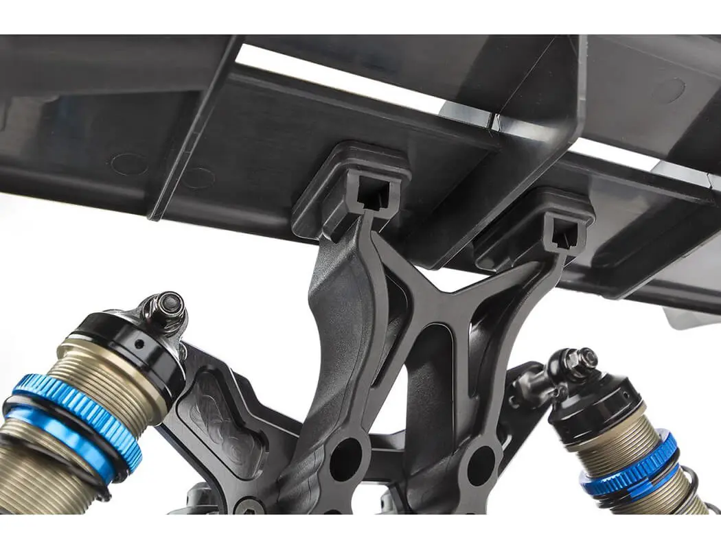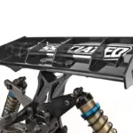 - RC8B4 rear wing mount has adjustable wing angle shims, significant strength improvements, an aerodynamic shape, and extra clearance for shock position adjustment.