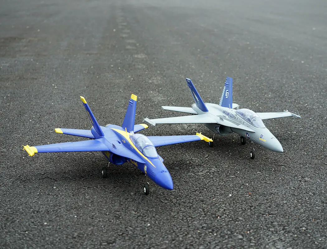The factory-installed power system, including twin efficient 1413-KV5500 brushless motors and twin 20A brushless ESCs, paired with a 4S LiPo battery, delivers an abundance of thrust for fast climbs, rolls, loops and endless fun for high alpha flying due to the F-18’s low wing load and full flying stabs. A flight time of around 3-8 mins can be achieved with proper throttle management.